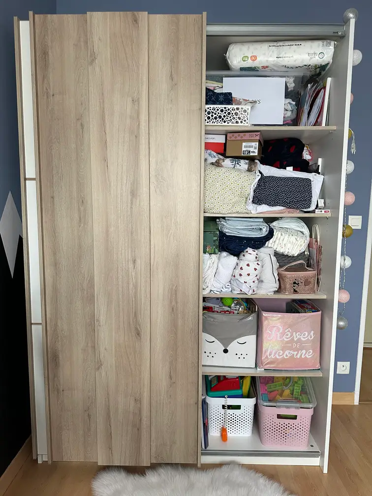 - Pour simplifier encore plus le rangement de la maison, je te propose de faire du tri régulièrement au fil de l’eau. Comment ça marche ? Dès qu’un vêtement est trop petit par exemple, sors-le immédiatement du dressing. L’idéal c’est de toujours avoir dans l’armoire, une panière “trop petit” pour libérer l’espace pratique immédiatement. De même avec les jouets. Si ton enfant s’est lassé d’un jouet ou qu’un jeu est incomplet, alors choisi de suite de le donner ou le vendre et désencombre.